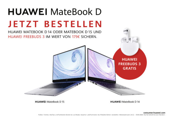 Wer bis zum 08.03.2020 ein MateBook D14 oder D15 vorbestellt erhält die Huawei Freebuds 3 im Wert von 159,99€ gratis dazu. In dem Aktionszeitraum sind auch die Preise für die beiden MateBooks reduziert. So kostet das D14 699€ (statt 879€) und das D15 649€ statt 829€.