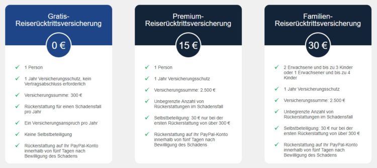 Neben der kostenlosen Rücktrittsversicherung bietet PayPal auch noch einen Premium-Schutz mit höherer Versicherungssumme von 2.500 € und ohne Rückerstattungsgrenze. Die Familien-Versicherung bietet die gleiche Versicherungssumme, jedoch für zwei Erwachsene und drei Kinder oder einen Erwachsenen und vier Kinder.