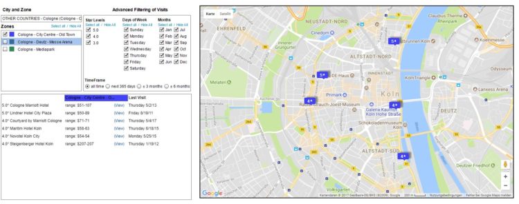 Es wird neben der Hotel-Liste (deutsche Städte findet man unter „Other Countries„) auch eine Karte angeboten, die direkt die Adresse der Hotels im ausgewählten Bereich auf Google Maps anzeigt und gleichzeitig noch eine Preisspanne angibt.