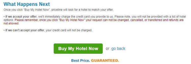 - Der von euch angebotene Preis wird von einem Hotel angenommen: Die Buchung ist final, die Kreditkarte wird direkt belastet und ihr erhaltet die genauen Hotelinformationen. Ihr erhaltet eine Bestätigung per Mail und im Priceline Profil (falls erstellt).