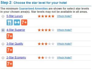 - Basierend auf den in den Bereichen verfügbaren Unterkünften werden nun verschiedene Hotelklassen von 1 bis 5 Sternen angeboten. Zudem zeigt Priceline an, wenn die bisherigen Bewertungen über 7/10 Punkten liegen oder ein Schwimmbad/Restaurant/Business Center etc. garantiert wird.