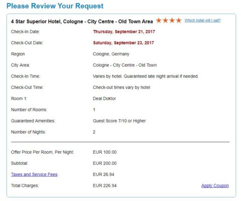 - Der von euch angebotene Preis wird in der/dem gewählten Gebiet/en nicht angenommen: Die Kreditkarte wird nicht belastet und ihr könnt erneut eine Anfrage senden. Falls möglich sollte bei der erneuten Anfrage Hotelgegend, Sterne Wertung und/oder Zeitraum geändert werden, um die Annahmewahrscheinlichkeit zu erhöhen. Natürlich kann auch der Preis erhöht werden.