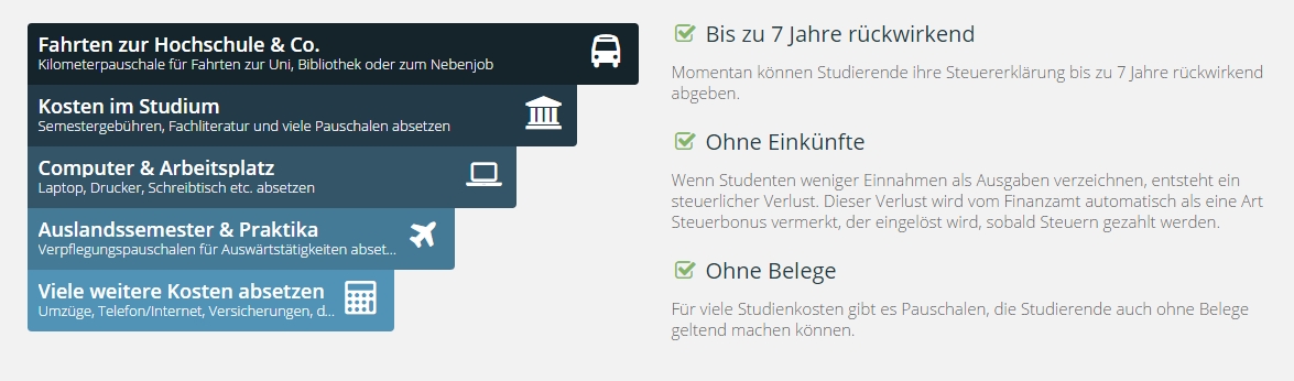 Macht ihr während eures Studiums eine Steuererklärung und gebt darin eure Werbungskosten an, bekommt ihr nicht sofort eine Steuerrückzahlung – ihr habt ja auch keine Steuern gezahlt. Die Werbungskosten könnt ihr aber als sogenannte Verlustvorträge geltend machen. Sobald ihr nach dem Studium eure erste Stelle antretet, könnt ihr diese mit eurem Einkommen und den darauf zu zahlenden Steuern verrechnen und einiges an Einkommenssteuer sparen.