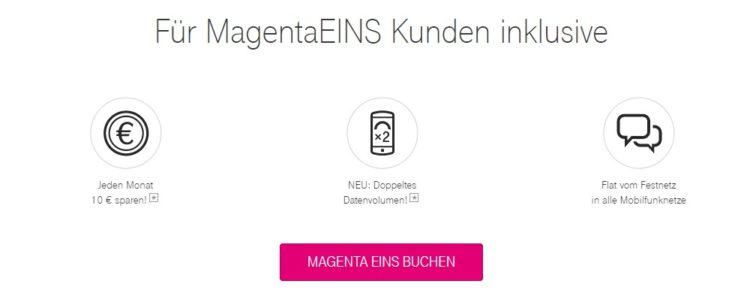 Telekom-Kunden und solche, die es werden wollen, können bei gleichzeitiger Nutzung von Mobilfunk- und Festnetz/Internet-Tarifen von einigen Vorteilen profitieren. Dazu zählen monatlich bis zu 10€ Mobilfunkrabatt, eine kostenlose Festnetz-zu-Mobil-Flat und neuerdings auch doppeltes Datenvolumen im Handyvertrag. Hier findet ihr alle Infos zu MagentaEINS.