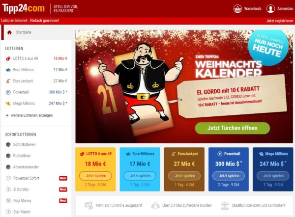 Wer online Lotto spielen möchte, ist bei Tipp24 definitiv an einer sicheren Adresse gelandet. Das Unternehmen hinter der Webseite ist schon seit vielen Jahren tätig und hat als Tipp24 bisher bereits mehr als 1,3 Milliarden Euro an Gewinnen ausgezahlt. Es kann also keinen Zweifel an der Seriosität geben, zumal der Anbieter mit einer offiziellen Lizenz der britischen Behörden arbeitet. Das Angebot an Lotterien ist enorm groß und beinhaltet neben den deutschen Klassikern wie dem Lotto 6aus49 und der Glücksspirale auch zahlreiche internationale Lotterien. Als Highlights lassen sich zum Beispiel der Powerball oder die Weihnachtslotterie „El Gordo“ aus Spanien nennen. Sollten einmal Fragen auftauchen, steht der Kundensupport auf verschiedenen Wegen Rede und Antwort. Alles in allem hat uns Tipp24 also voll überzeugen und seinen Ruf als erstklassiger Anbieter untermauern können.