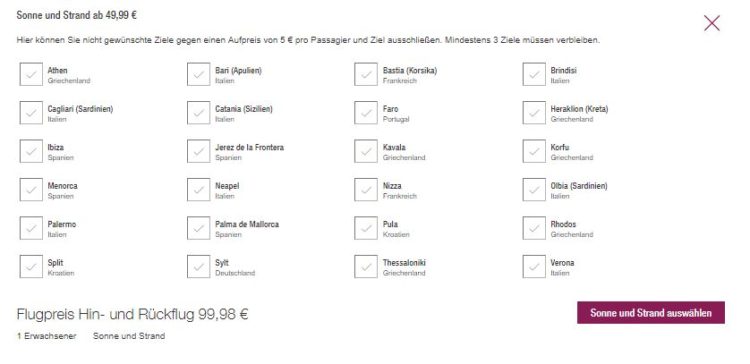 - Lufthansa – Abflughafen wählen (nur ab Frankfurt/Main oder München) und Flugziel auswählen – ab 69€