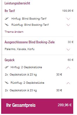Wenn man nun beispielsweise die Kategorie Sonne und Strand bucht und da drei Ziele ausschließt, ihr zu zweit reist und pro Person noch je 23 kg dazu bucht, landet ihr für den Flug ins Ungewissen doch bei 290€ insgesamt- jenachdem wo ihr landet, kann das sehr günstig oder aber auch eher teuer sein.