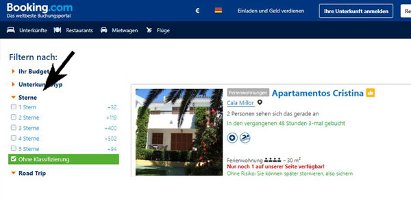 - booking.com – im Filter den Haken bei dem Punkt „ohne Klassifizierung“ setzen
