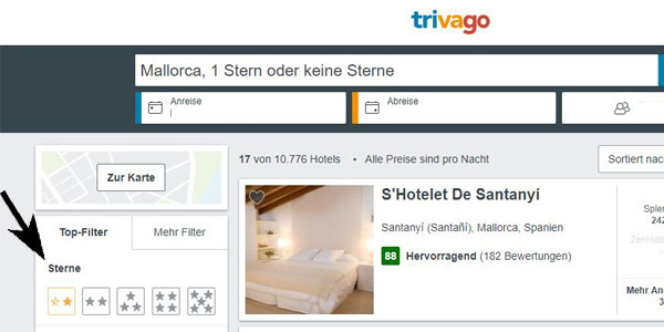 - trivago – der „kein Stern“ und 1 Stern-Filter sind gemeinsam auswählbar