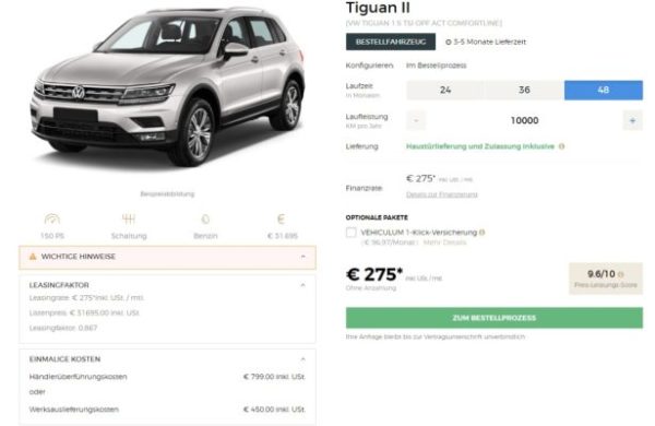 Die Angebote werden bei Vehiculum deutschlandweit verglichen, sodass man das für sich passende Angebot heraussuchen kann. Bei der Laufzeit hat man die Wahl zwischen 24, 36 oder 48 Monaten.