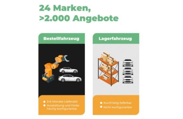 Bei den Fahrzeugen hat man die Wahl zwischen Bestell-, Lager- und Vorbestellerwagen. Bestellfahrzeuge sind dabei komplett nach den eigenen Wünschen konfigurierbar, haben aber eine längere Lieferzeit. Lagerfahrzeuge sind vorkonfiguriert, dafür schon innerhalb von 4 bis 8 Wochen lieferbar und von „Leasingexperten konfigurierte Vorbesteller sind zu attraktiven Konditionen verfügbar„. Man hat hier also die freie Wahl, je nachdem wie dringend man das Auto benötigt und wie wichtig einem die persönliche Anpassung ist.