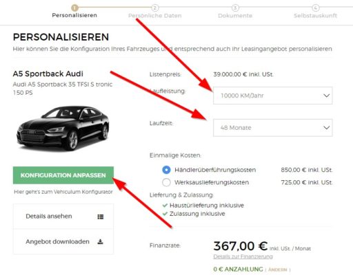 - Angebot wählen und personalisieren (Laufleistung und Laufzeit, auf Wunsch auch einzelne Extras unter „Konfiguration anpassen“)