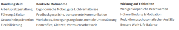 - Regelmäßige Mitarbeitergespräche zur Früherkennung von Belastungen
