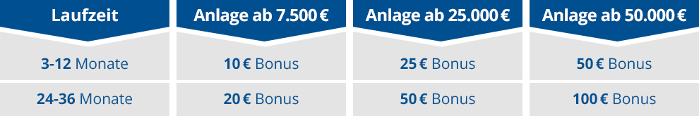 [icon name=“check-square“ class=““ unprefixed_class=““] bis zu 100€ Bonus je nach Anlagedauer und Anlagesumme (Bsp: 10.000€ für 1 Jahr: 10€ Bonus)