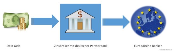 Ein Zinsbroker ist selbst keine Bank, sondern ein technischer Abwickler, quasi ein Serviceunternehmen, das mit einer deutschen Partnerbank als Drehscheibe fungiert und das Geld der Kunden an die entsprechenden ausländischen Banken vermittelt. Dafür bekommt der Broker eine Provision von der ausländischen Bank. Ihr als Kunde habt den Vorteil der deutlich besseren Zinsen und müsst zudem natürlich nur einmal ein Identifizierungsverfahren (Postident/Videoident) für das bei der deutschen Bank zu eröffnende Verrechnungskonto (kein Girokonto!) durchlaufen, nämlich bei der deutschen Partnerbank des Zinsbrokers. Euer Geld könnt ihr dann schön bei allen möglichen im Portfolio des jeweiligen Anbieter befindlichen Banken diversifizieren und damit auch das Risiko minimieren – eine weitere Identifizierung bei einer anderen Bank ist nicht mehr notwendig. Es fallen für den Kunden hierbei keinerlei Kosten an.