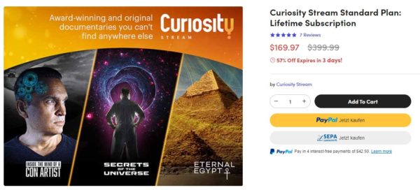 Wir hatten ja in der letzten Zeit schon öfter über Deals von Stacksocial im Blog berichtet, jetzt bekommt ihr einen neuen Deal, den Curiosity Stream Standard Plan: Lifetime Subscription für nur $169,97, dies entspricht ~156€ (regulärer Preis ~$400 ~368€) Ersparnis ~212€