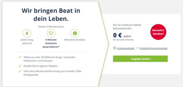 Coole Aktion! Bei mobilcom-debitel ist gerade eine richtig gute Aktion gestartet, bei der ihr 4 Monate Deezer Premium (56 Mio. Songs, Hörbücher, Podcasts) komplett kostenlos bekommt.