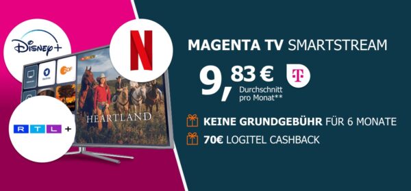 Jetzt bekommt jeder bei Telekom – egal ob Neu- oder Bestandskunden – das MagentaTV Smart Paket über 24 Monate zu guten Konditionen. Damit habt ihr Zugriff auf über 150 Sender in HD (insgesamt 160 sogar), sowie auf etliche Serien und Filme in der Mediathek und zusätzlich ist im Abo auch RTL Plus Premium enthalten. Als Prämie gibt es dann bis zu 70€ Cashback!