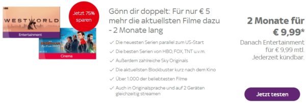 Alternativ auch erhältlich: Sky Ticket Cinema (Kinofilme) & Entertainment (Serien) zusammen 2 Monate lang für einmalig 9,99€ – Cinema kündigt sich automatisch, Entertainment läuft für 9,99€/Monat weiter.