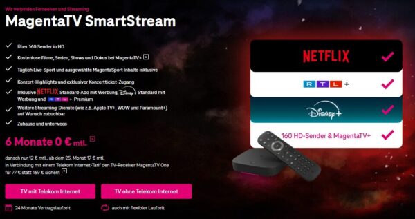 Direkt bei der Telekom gibt es den Telekom MagentaTV SmartStream inkl. RTL+ Premium, Netflix & Disney+ mit Werbung für für effektiv 9€/Monat.