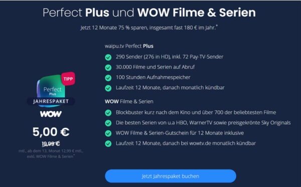 💥 75% Rabatt waipu.tv Perfect Plus und WOW Filme & Serien / 12 Monate für nur 5€/Monat*