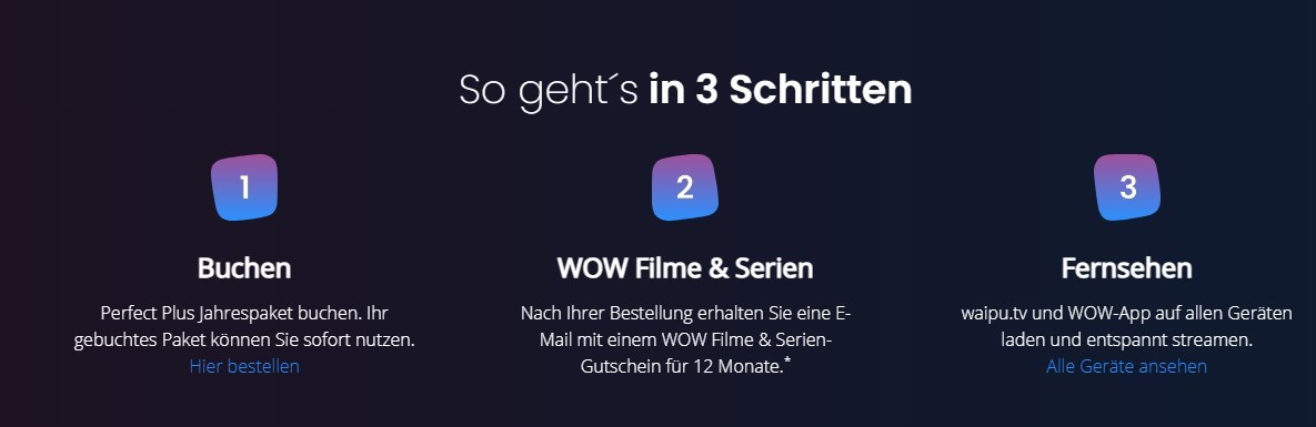 Kunden, die im Aktionszeitraum das waipu.tv Perfect Plus mit WOW Filme & Serien Jahrespaket kaufen, erhalten einen Gutschein für 12 Monate WOW Filme & Serien. Für diesen gelten die unten genannten Einlösebedingungen.**