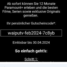Promo Code und Einlösung: Um den Gutschein einzulösen, müssen Sie diesen auf wowtv.de/waiputv eingeben, sich registrieren (oder sich anmelden), gültige Zahlungsdaten (Klarna, Kreditkarte, Paypal oder WOW Geschenkkarte) angeben und den Gutscheincode auf der Zahlungsseite eingeben. Eine Einlösung ohne Zahlungsdaten ist leider nicht möglich. Die Einlösung der Codes ist bis 31.12.2024 möglich.