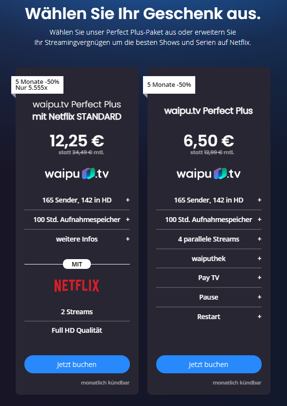 *GÜNSTIGER ALS NETFLIX* Waipu Special: 50% Rabatt über 5 Monate: Netflix + 165 TV-Sender für 12,25€/Monat (statt 24,50€) oder nur TV für 6,50€/Monat (statt 13€)