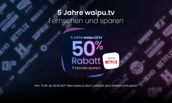 Bei Waipu.TV erhaltet ihr zum 5. Geburtstag satte 50% Rabatt für 5 Monate auf das Perfect Plus sowie das Perfect Plus Paket inkl. Netflix. 🙂