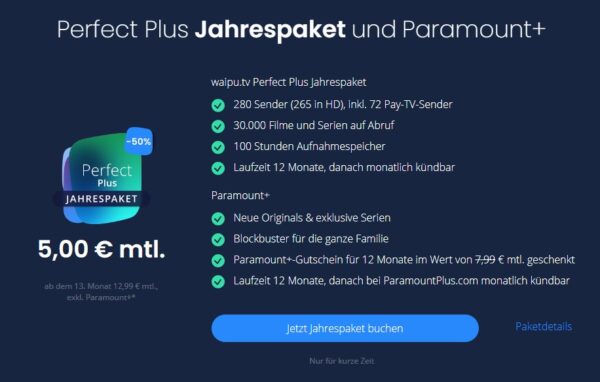Im Rahmen der Aktion erhalten Neukunden einen satten Rabatt von 50 % auf das Perfect Plus Jahrespaket und zahlen anstatt 9,99€ nur sensationelle 5,00 € monatlich. Doch damit nicht genug, denn on top gibt es 12 Monate Paramount+ geschenkt!