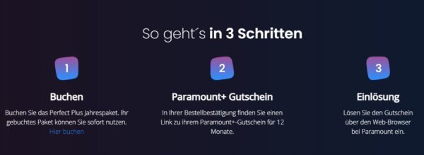 Kunden, die innerhalb des Aktionszeitraums über die Aktionsseite ein Perfect Plus-Jahrespaket buchen, erhalten zusätzlich einen Gutschein für 12 Monate Paramount+.** Dieser kann direkt aus der Bestellbestätigungs-E-Mail abgerufen werden.