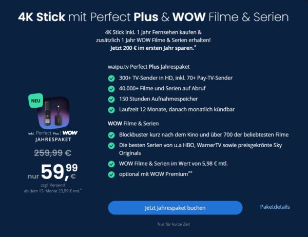 🔥 *TOP* waipu.tv 4K Stick + 12 Monate Perfect Plus + WOW Filme & Serien – für nur 64,98€ statt 264,64€