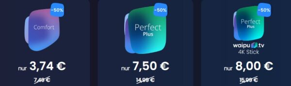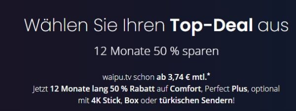 Stark, nur für kurze Zeit könnt ihr euch 50% Rabatt dank Gutschein auf die mtl. kündbaren Paket von Waipu.tv sichern.
