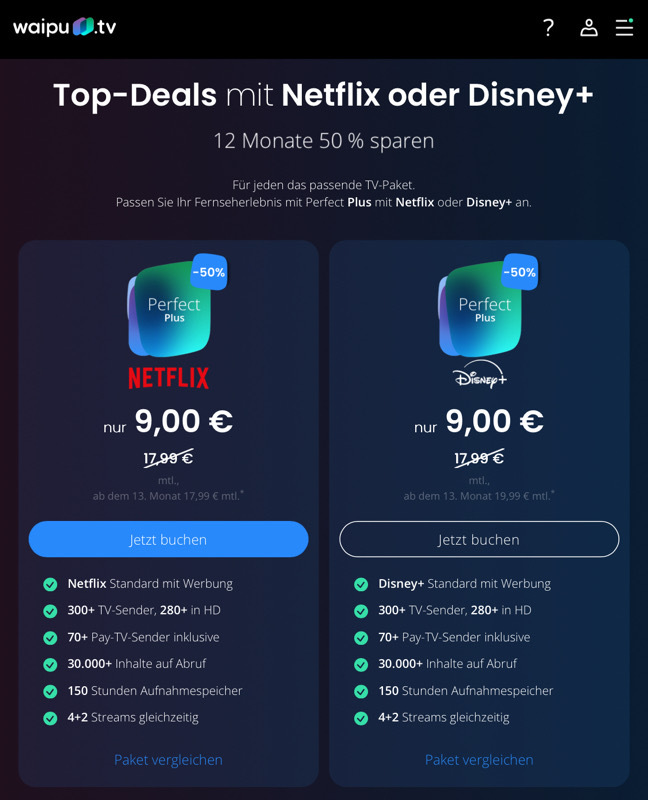 - Perfect Plus Paket + waipu.tv Box für 9€/Monat (statt ~17,99€/Monat)