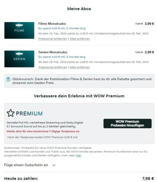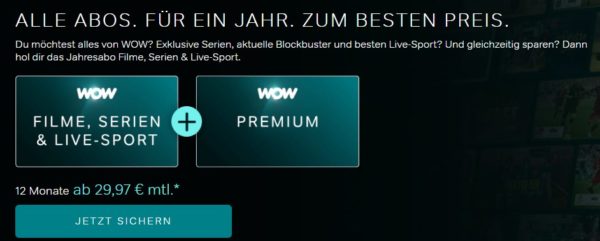 - Alles von WOW (Sport, Filme & Serien) für 29,97€/Monat (statt 44,97€/Monat)