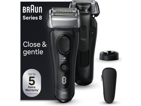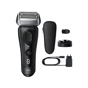 - Lieferumfang: Elektrorasierer, Ladekabel, Ladestation, Reinigungsbürste, Reise-Etui