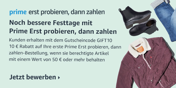 Ab 1. Dezember bis Ende des Jahres erhalten Kunden mit dem Gutscheincode GIFT10 10 € Rabatt auf Ihre erste Erst probieren, dann zahlen-Bestellung, wenn sie berechtigte Artikel mit einem Wert von 50 € oder mehr behalten.