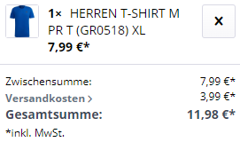 Es fallen Versandkosten in Höhe von 3,99€ an, die bei Bestellungen ab 70€ entfallen. Eine eventuell anfallende Retoure ist bei vorheriger Bestellbezahlung mit PayPal kostenfrei.