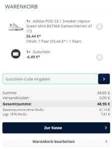 Man muss sagen, dass hier die Größenauswahl so ziemlich reichlich ist – selbst 49,5 sind verfügbar! Einfach das gewünschte Produkt in den Warenkorb legen und im Popup rechts den Gutschein einlösen. 🙂