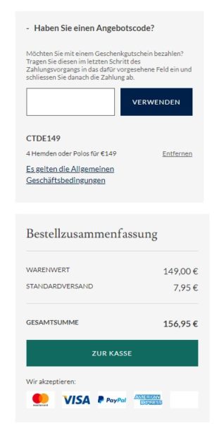 Verwendet für die 4 Hemden den Gutschein CTDE149 im Warenkorb an, um Rabatt zu erhalten.