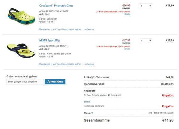 Im Crocs Onlineshop bekommt ihr gerade 40% Rabatt ab 2 Paar Schuhen
