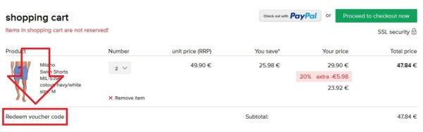 Klickt dafür im Warenkorb dann einfach auf „Redeem voucher code“, dann öffnet sich das Eingabefeld.