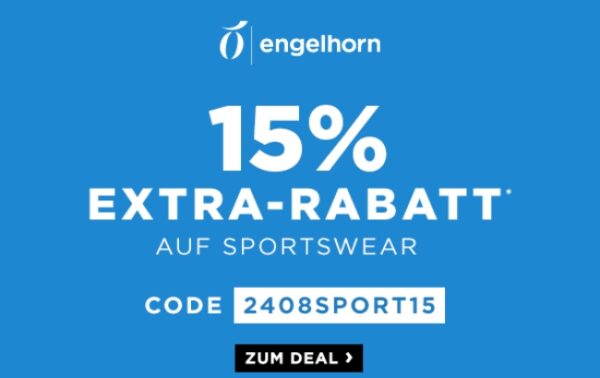 Bei Engelhorn erhaltet ihr bis einschließlich 13. August satte 15% Extra-Rabatt auf ausgewählte Artikel der Kategorie „Sportswear“. 🙂