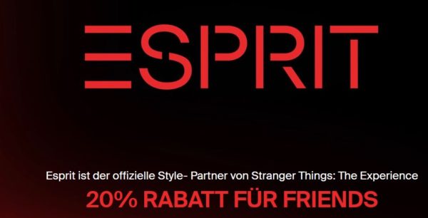 Gültig für Esprit Friends bis 10.05.2023 in allen teilnehmenden Stores und im E-Shop. Der Code „STRANGER20“ kann während des Angebotszeitraums nur einmalig eingelöst werden. Die Artikel der Aktion sind entsprechend gekennzeichnet. Esprit Friends erhalten zusätzlich 3% Esprit-Bonus in Form von e-points. Kann nicht mit anderen Aktionen oder Gutscheincodes kombiniert werden. Teppiche, Geschenkkarten und Sonderkollektionen sind von der Aktion ausgeschlossen.