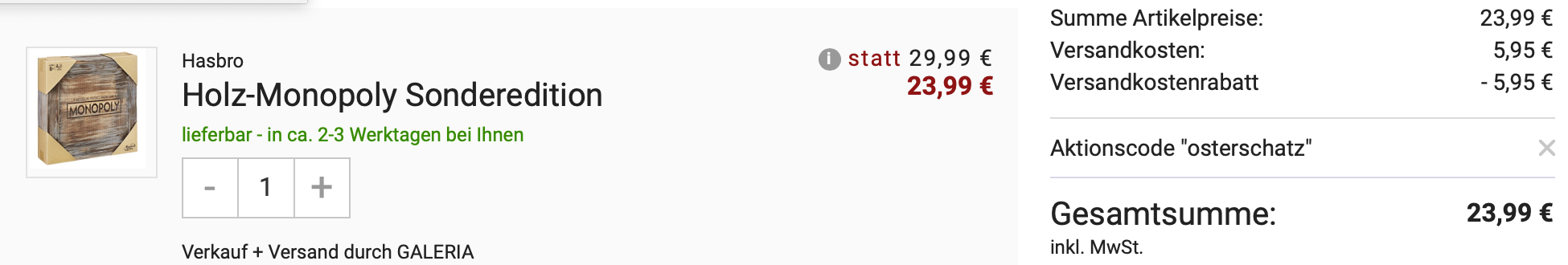 Matthi 05.04.2020, 20:04 #Monopoly Holz Sonderedition mit dem Gutscheincode osterschatz für 23,99€: https://www.galeria.de/Hasbro-Holz-Monopoly-Sonderedition/5153314903.html