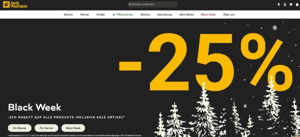 Nur bis zum 27.11.2023 gibt es bei Jack Wolfskin 25% Rabatt auf fast ALLES! (Rabatt wird automatisch auf der Warenkorbseite abgezogen)