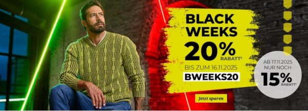 Gültig bis 16.11.2025. Ab einem Mindesteinkaufswert ohne Rabatt (nach Retoure) von 60 €. Pro Kunde kann nur ein Rabattcode verrechnet werden. Der Rabattcode ist nicht übertragbar und nicht mit anderen Rabatt-Aktionen kombinierbar. Eine Rückvergütung auf bereits getätigte Einkäufe ist nicht möglich.