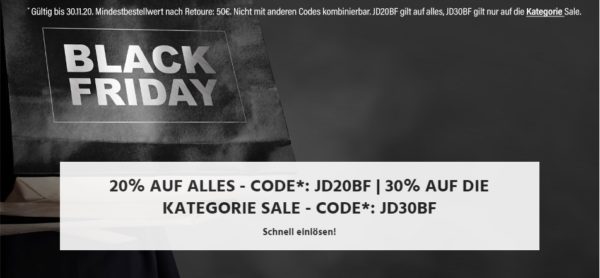 Für den 20% Rabatt müsst ihr den Gutschein JD20BF verwenden und für 30% den Code JD30BF.