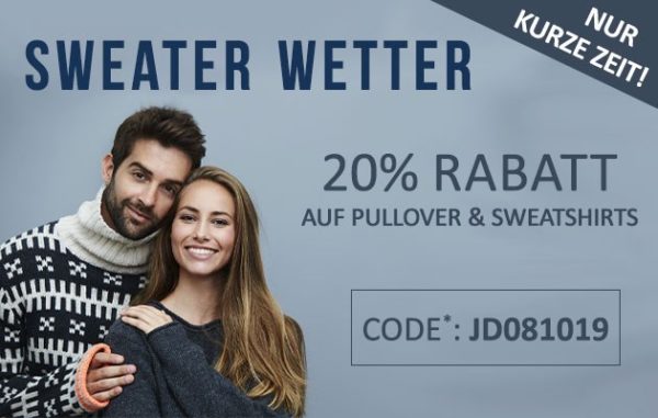 Bei JeansDirect erhaltet ihr bis einschließlich 18. Oktober satte 20% Rabatt auf Pullover & Sweatshirts.