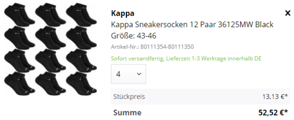 Denn bei SportSpar bekommt man die Kappa Sneakersocken 36125MW (12-Paar) für 17,08€ (Vergleichspreis: ~27€) Ersparnis ~10€